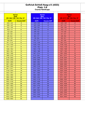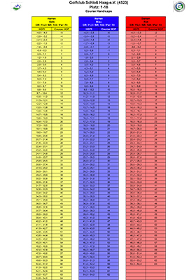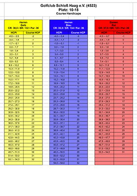 Hier finden Sie die ab dem 1.1.23 geltenden Course Rating Tabellen (früher:Spielvorgaben) für unsere Plätze:
