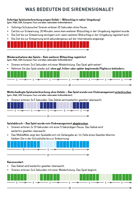 Beim Signal „Sofortige Spielunterbrechung wegen Gefahr“ (25 Sekunden ohne Pause) suchen Sie bitte sofort die nächstgelegene Schutzhütte oder das Clubhaus auf.